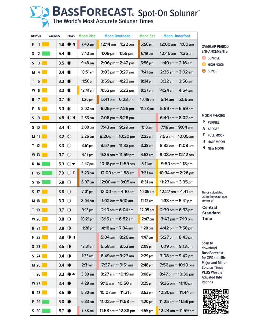 Bass Fishing with Solar Lunar Predictions for November 2024 – Central Time Zone (CST)