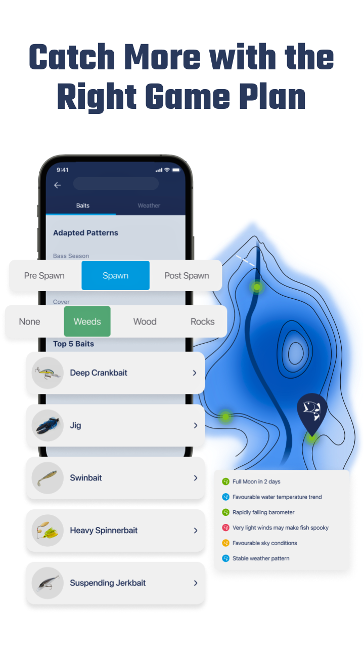 Adapted Patterns™ predetermines the perfect baits for any location, season, or structure. It analyzes factors like moon phase, water temp, season, and water structures to recommend the perfect baits for your specific situation. Think of it as a cheat code for matching your bait to what the fish want right now. Just pick the day, then scenario plan baits, cover, structure and more with this powerful feature.